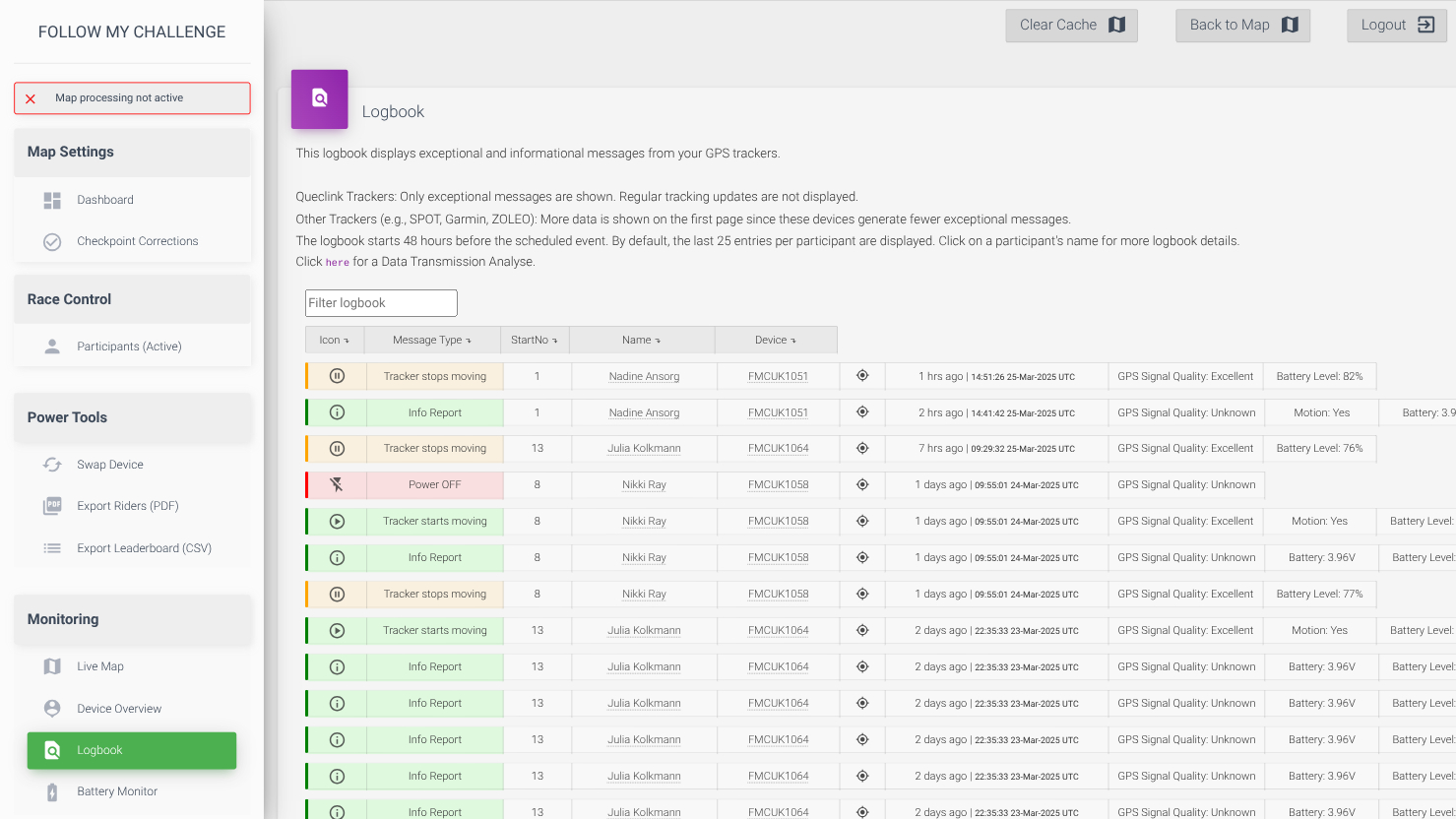 The Logbook allows you to access a detailed log of all data transmitted by trackers during an event. The logbook begins recording 48 hours before an event starts. On the main overview page, you will see only exceptional/notable messages.