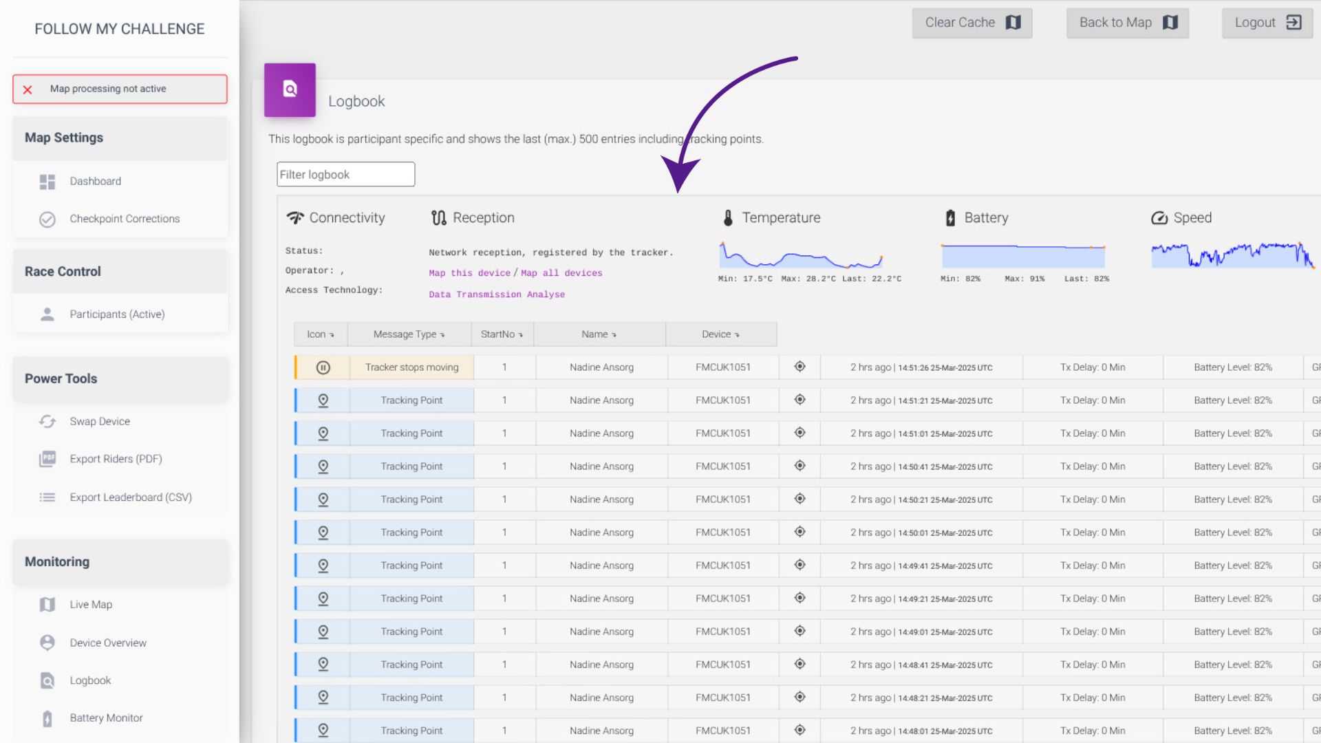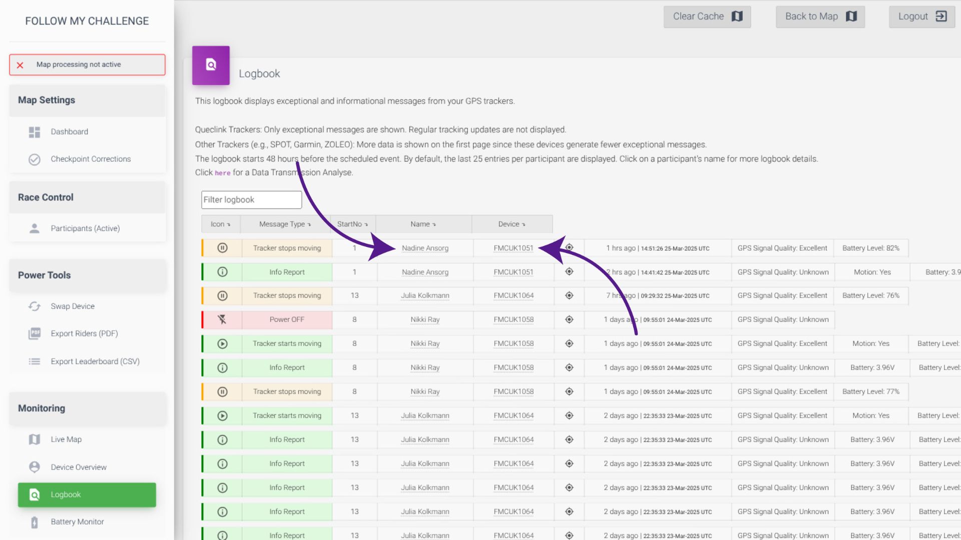 To see the detailed logbook for a specific tracker, click on the participant name or tracker ID. You can find the device you require by using the filter box to search.
