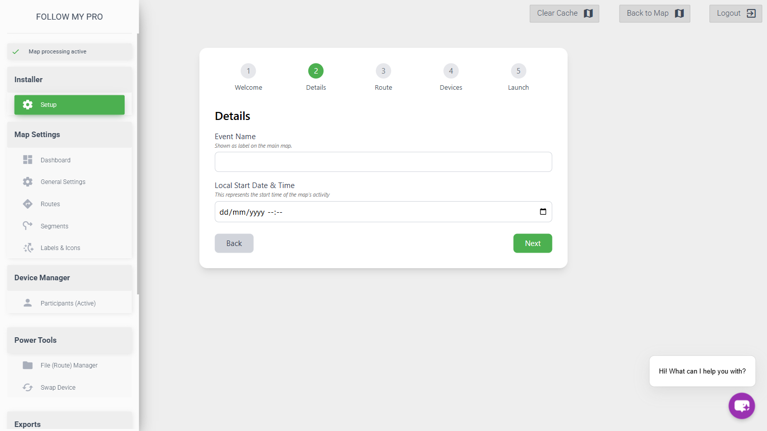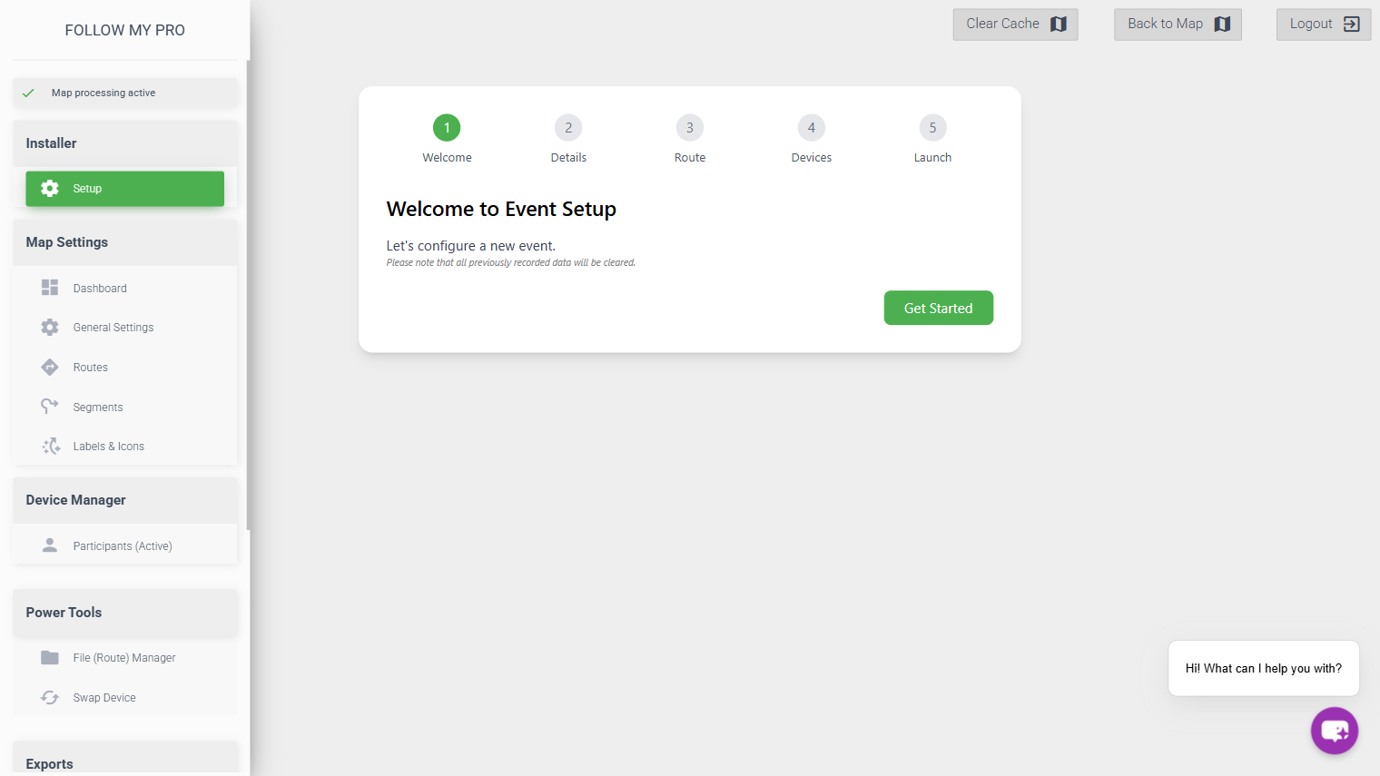 The event setup wizard allows you to quickly configure the map for a new event, importing the required data. It will clear all existing data within the map.