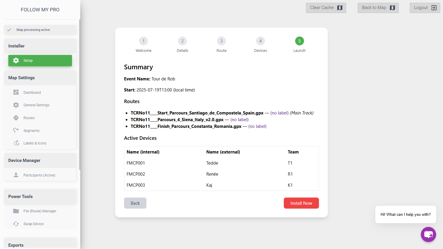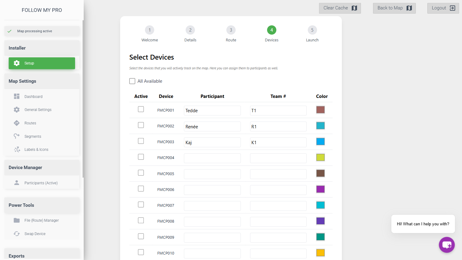 The next step is to activate and customise the devices you would like to appear on the map. All available devices will be displayed and you can activate them individually or select all. You can also assign names (previous names will remain for ease of repeating) and numbers, as well as choosing colours.